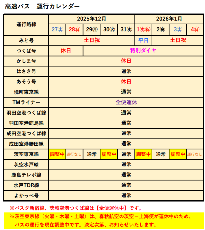 高速バス 年末年始の高速バス運行ダイヤについて 2025.11.28 2025.11.28 関東鉄道では、年末年始の高速バスを下記ダイヤにて運行します。ご利用の際はご注意願います。 ●つくば号 ⇒ お知らせ ●TMライナー ⇒ お知らせ ●あそう号 ⇒ お知らせ 【高速バス運行カレンダー】 ・お問い合わせはお知らせや時刻表等に掲載されている運行営業所へお願いします。
