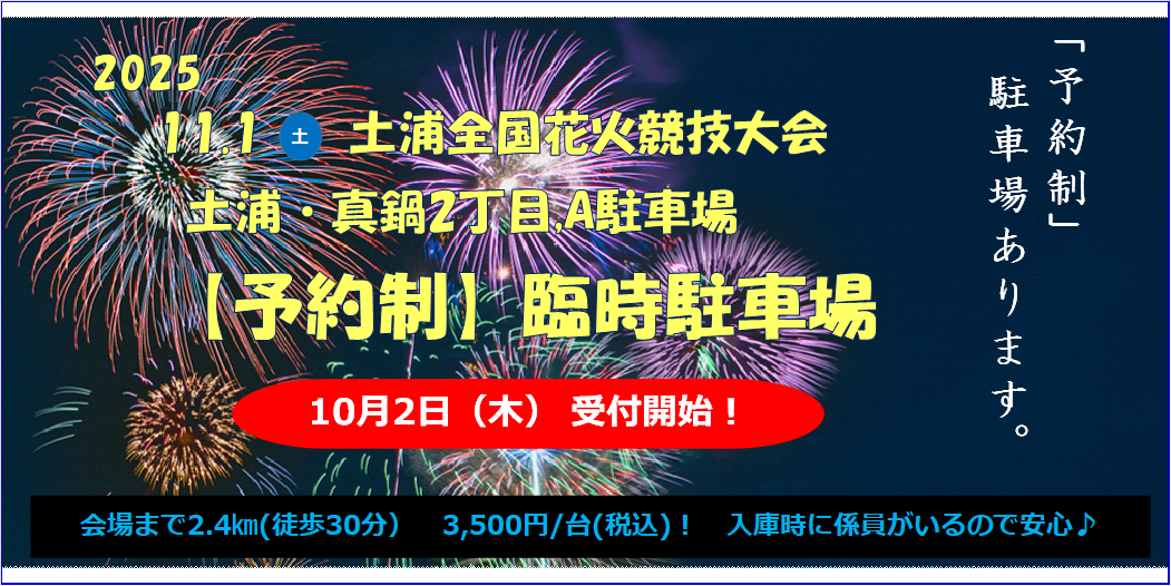 2025年11月1日(土)土浦全国花火競技大会へお越しの方へ、開催日に予約制の臨時駐車場(有料)を設置します。ご希望の方は下記の申込フォーム(Pass Market)からご予約下さい。(臨時駐車場から会場までは①真鍋A駐車場は2.4km、徒歩30分、②真鍋二丁目駐車場は2㎞、徒歩25分です。)